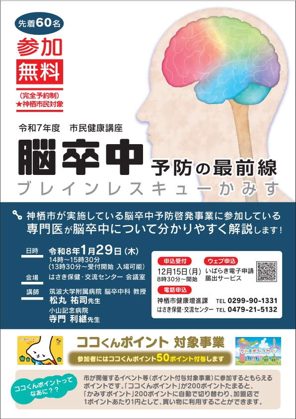 神栖市が実施している脳卒中予防啓発事業にご協力いただいている専門医が、脳卒中についてわかりやすく解説します!お気軽にご参加ください。